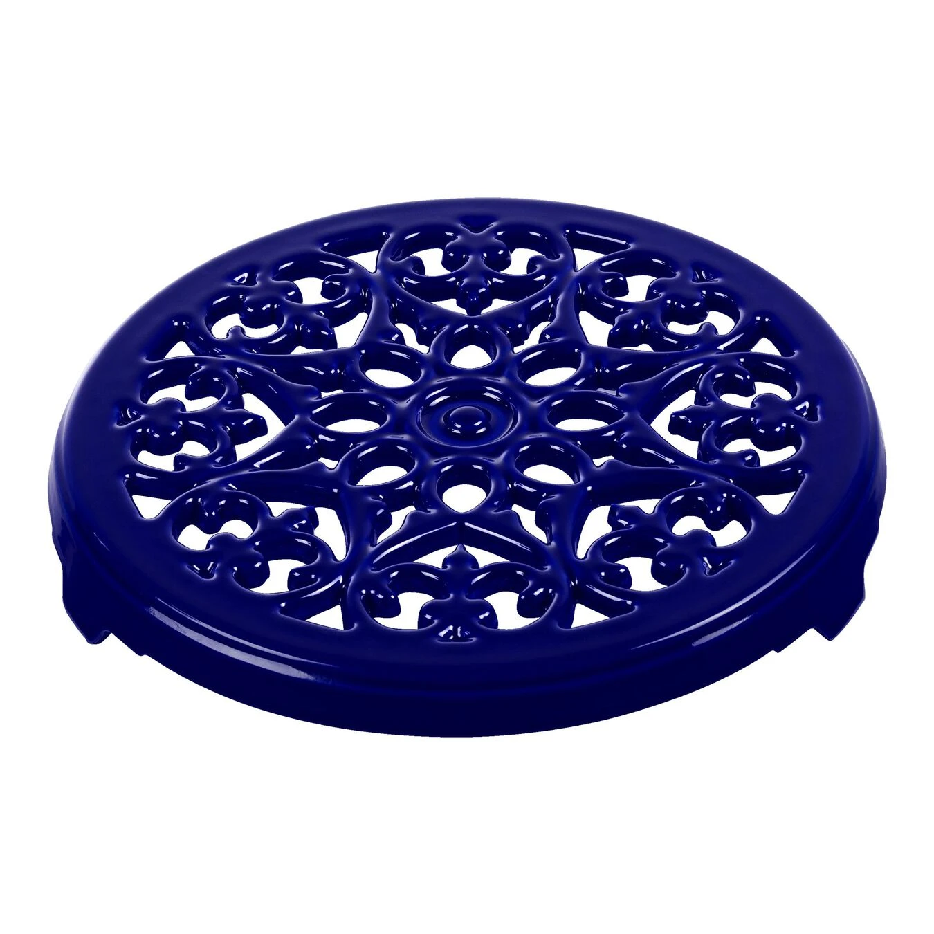 The dark blue cast iron pot stand from the Staub Accessories range provides a stable and practical means to safely set down pots, tea kettles, gratin dishes, baking tins or other hot objects. Measuring 23 cm, the round stand is also a beautiful eye-catcher thanks to its special and intricate design with the circular lily motif. This heraldic lily used to adorn the coats of arms of emperors and kings ” and now it embellishes this stylish and helpful accessory for your kitchen and dining room by Staub.