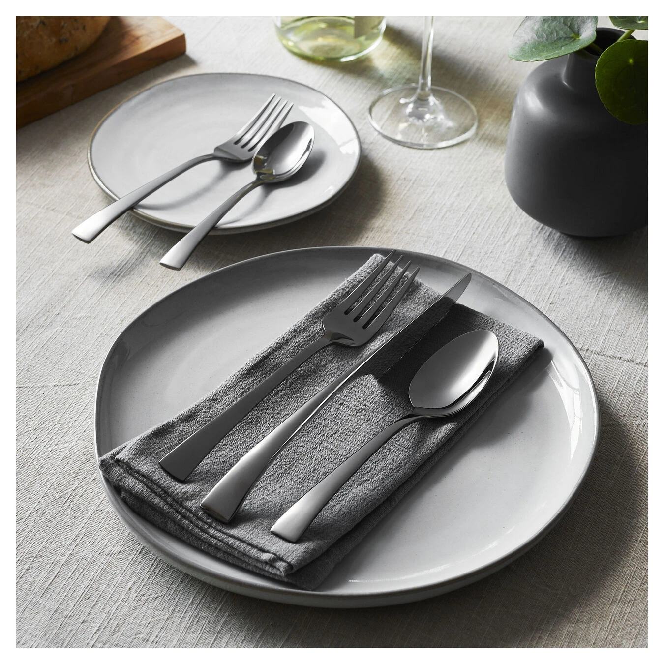 This Bellasera set features contemporary styling, fashioned with a unique standing knife design that makes an elegant statement at the table. With a satin finish, this modern design is a perfect complement to any table setting. This set features 4 x 5-piece place settings.