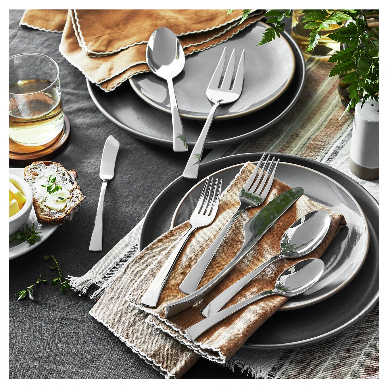 - Set includes 4 x 5-piece place settings. 5-piece setting includes dinner fork, salad fork, soup spoon, teaspoon, and dinner knife. Serving pieces include 1 serving spoon, 1 serving fork, and 1 butter knife