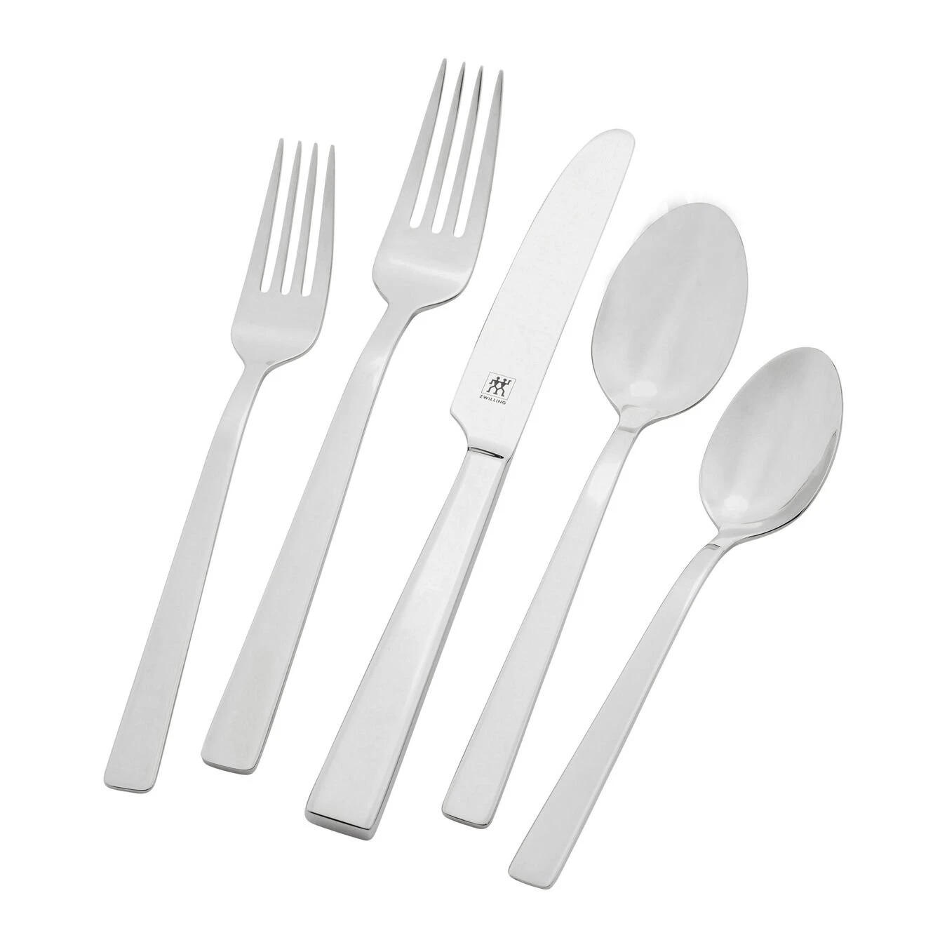 - Set includes 8 x 5-piece place settings. 5-piece setting includes dinner fork, salad fork, soup spoon, teaspoon, and dinner knife. Serving pieces include serving spoon and fork, slotted spoon, butter knife, and sugar spoon.
