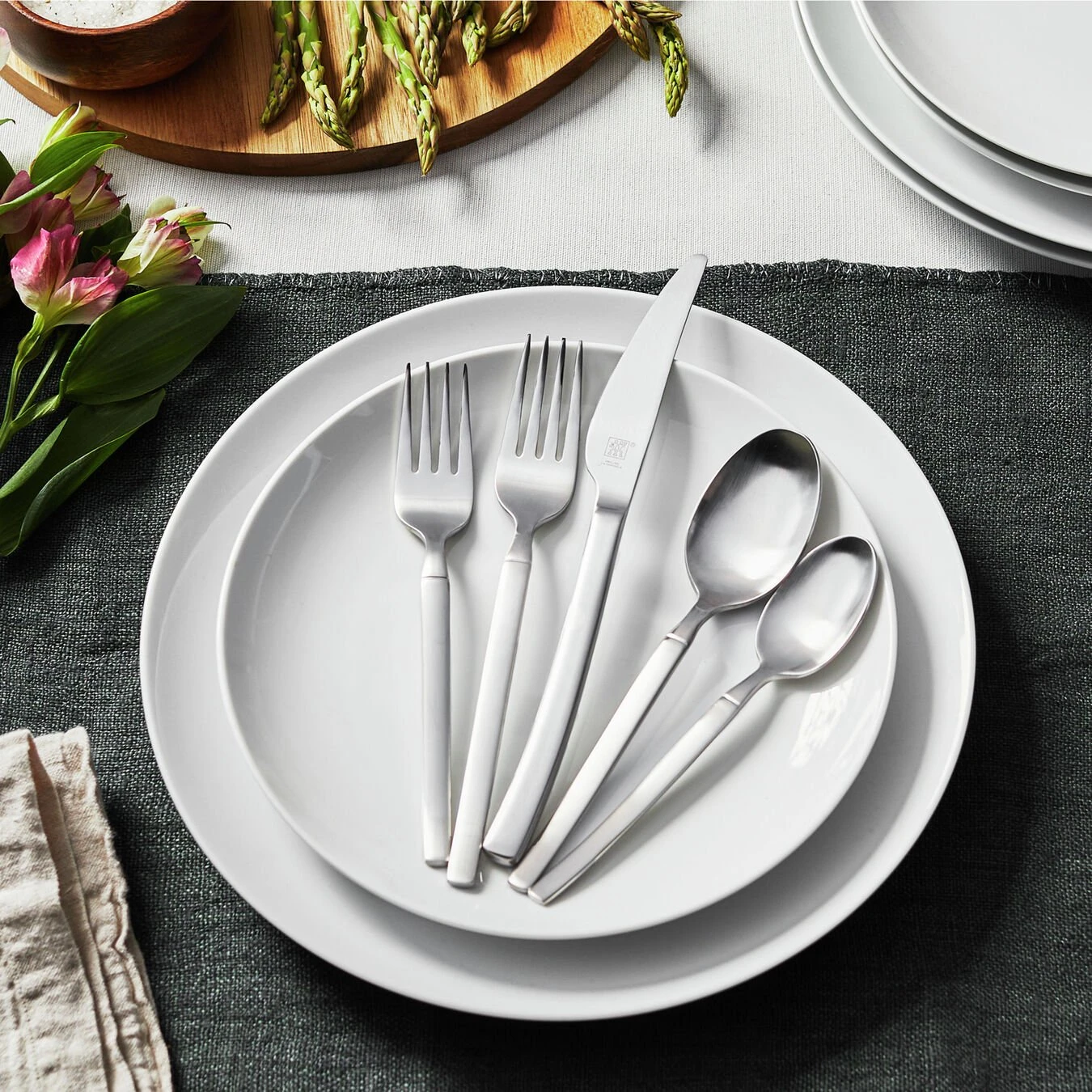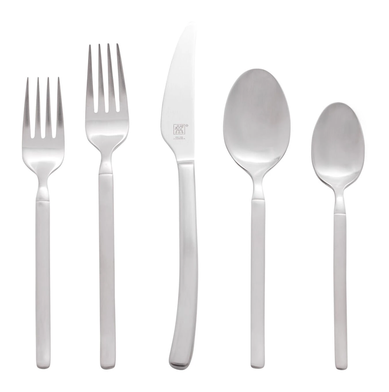 Opus features a contemporary European design that is a perfect complement to any table setting. This satin-finished flatware features a subtle curve at the end of each handle that communicates understated elegance. This set features 8 x 5-piece place settings plus 5 key serving pieces.