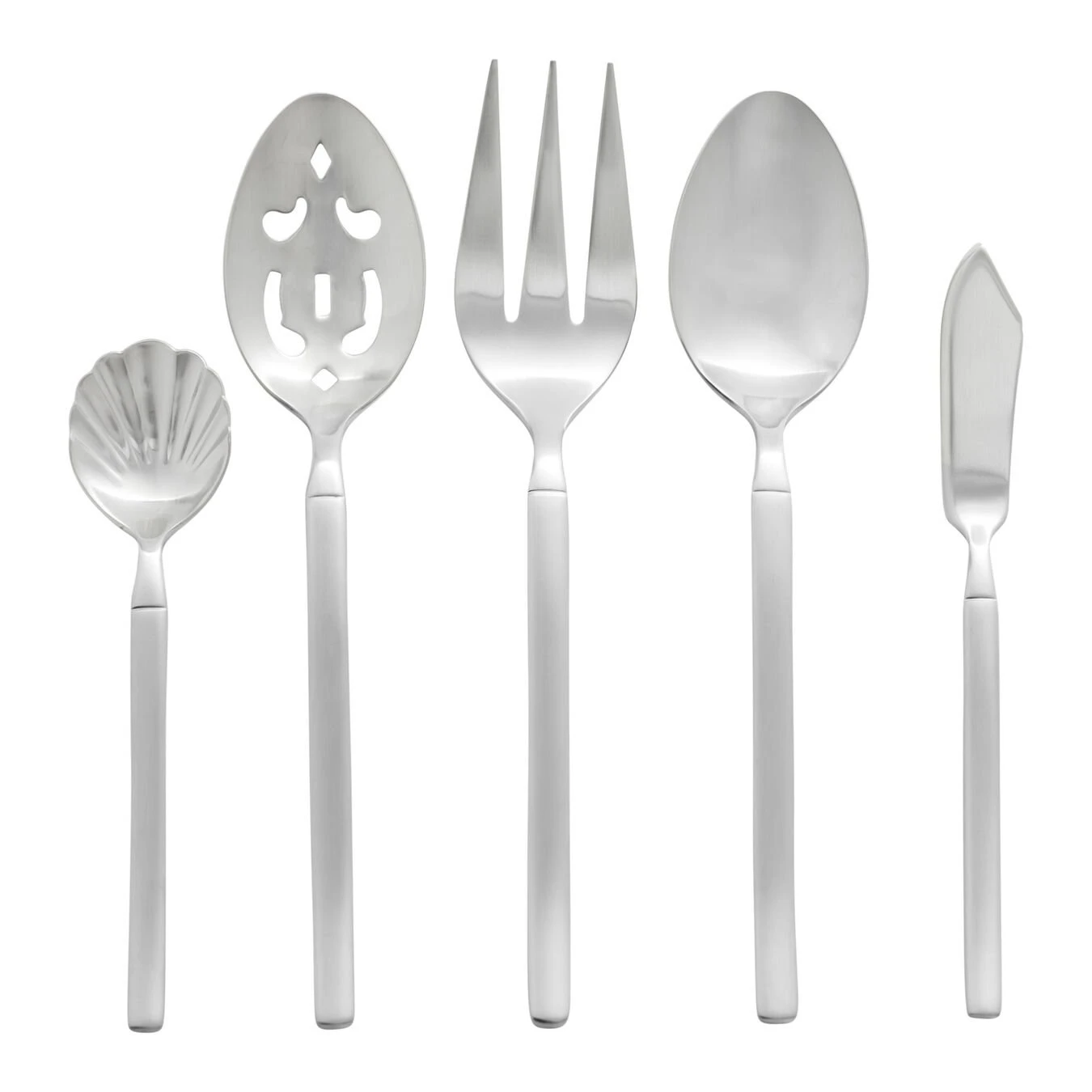 - Set includes 8 x 5-piece place settings. 5-piece setting includes dinner fork, dinner knife, dinner spoon, salad fork, and teaspoon. Serving pieces include serving spoon and fork, slotted serving spoon, butter knife and sugar spoon