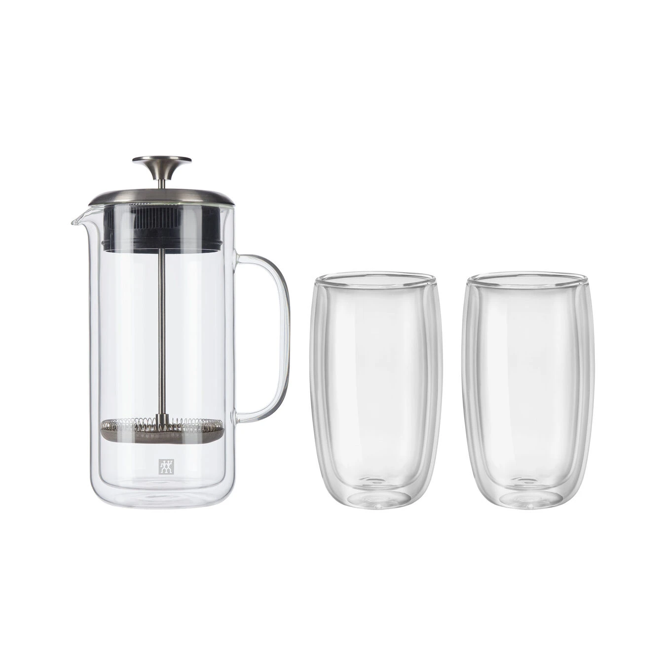 The 3-piece French Press and Latte Glass Set lets you brew and enjoy the perfect cup of coffee. These elegant and sophisticated double wall glasses maintain the toasty temperature of lattes and other hot beverages while remaining cool to the touch. And cold drinks, such as iced lattes, stay chilled without leaving messy condensation rings on the table. They are truly as beautiful as they are functional.